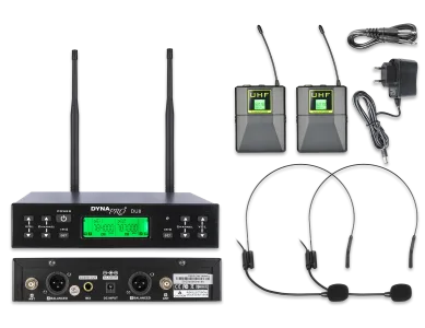 Unleash your voice with the DYNApro Dual Wireless Microphone System, a versatile audio solution that's perfect for both captivating stage performances and the comfort of home use. Designed with precision and reliability in mind, this microphone system offers a range of exceptional features:Single Microphone: The system includes one wireless microphone, allowing for single performer or applications to use it​​.Durable Construction: The receiver chassis is made of metal, ensuring sturdiness and longevity. Additionally, the handheld microphones have bodies crafted from aluminum alloy, which is both lightweight and robust.Frequency Range: It operates in the UHF band, specifically in the frequency range of 560-960MHz. This wide range helps to minimize interference and provide a stable audio connection.Channel Setup: The system uses ACT channel setup and IR auto scanning technology, making it easy to configure and ensuring reliable connectivity.Selectable Frequencies: With a total of 100 selectable frequencies for each microphone (200 in total), it offers flexibility in finding clear and interference-free channels.LCD Displays: Both the receiver and transmitter (microphone) feature LCD displays, allowing you to monitor the system's working status. This includes details such as battery life, signal strength, and channel settings.Smart Design: The handheld microphones are equipped with smart features, making them user-friendly and versatile. The receiver is designed to be rugged and compact, fitting well in a half-rack size.